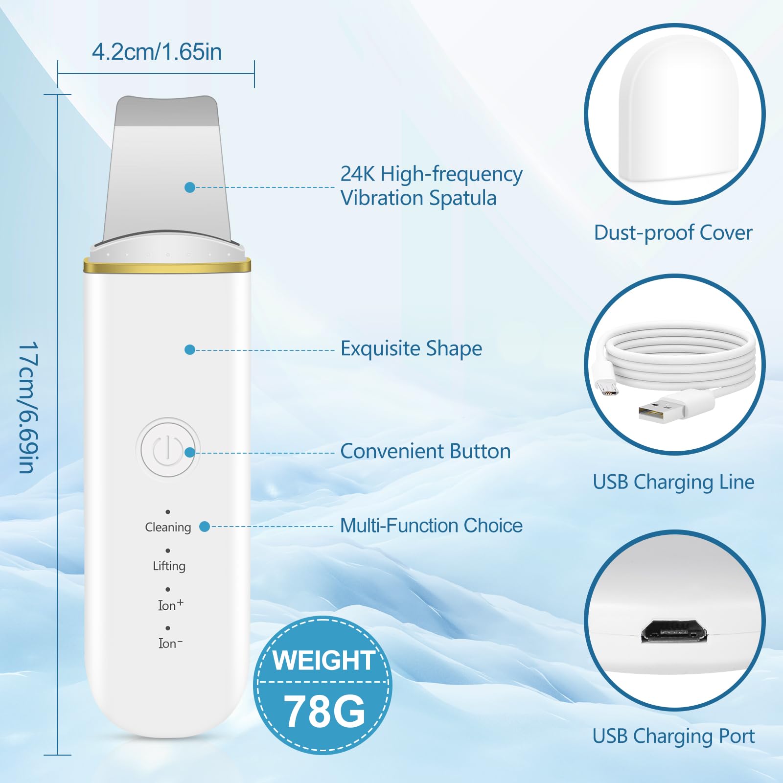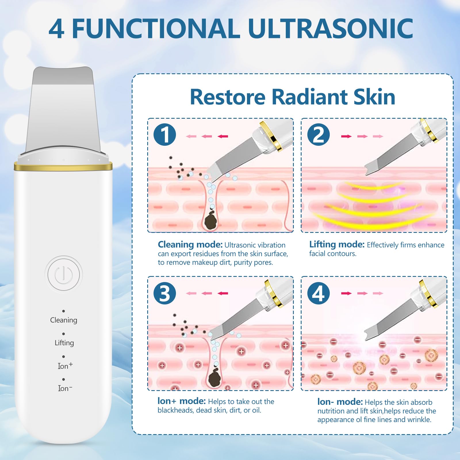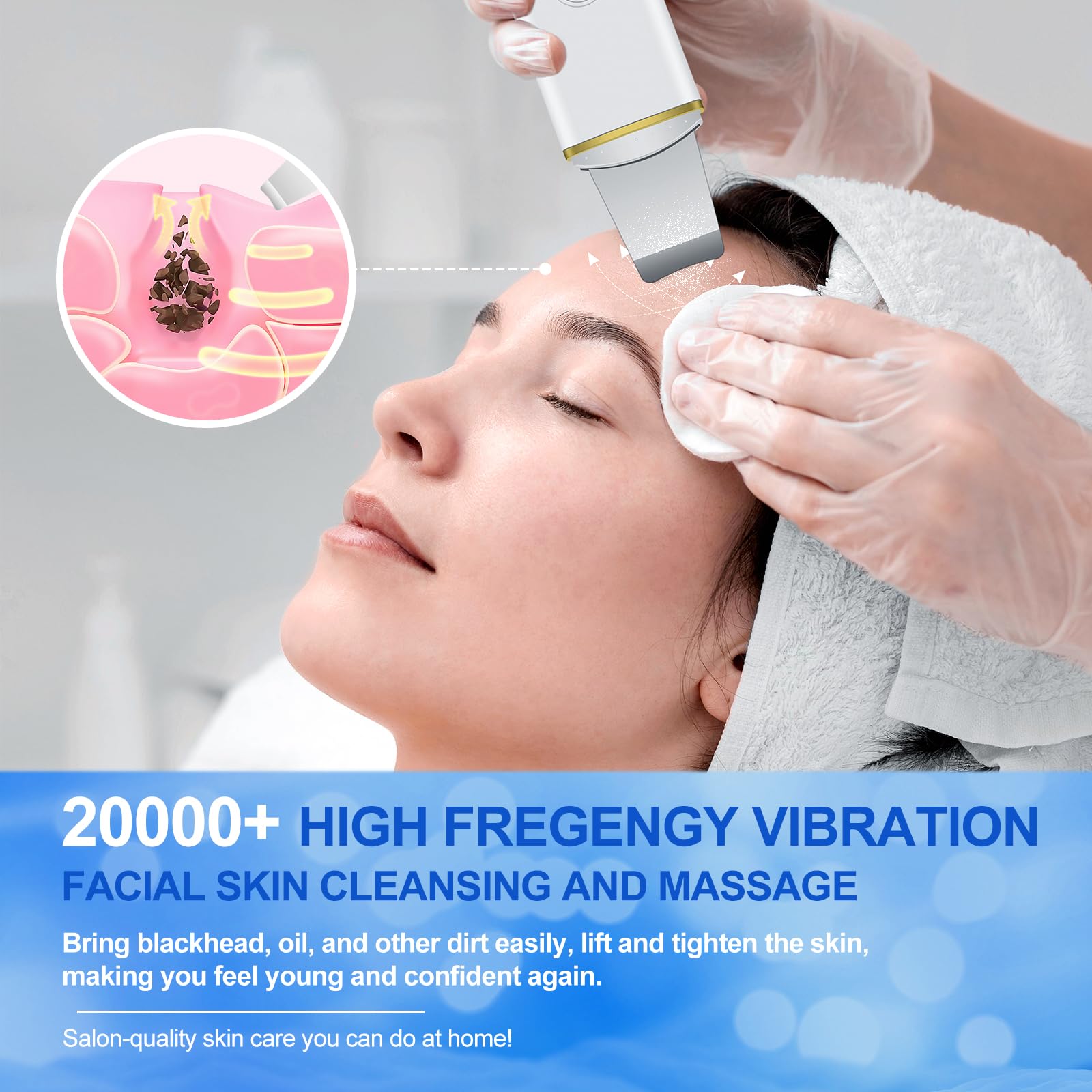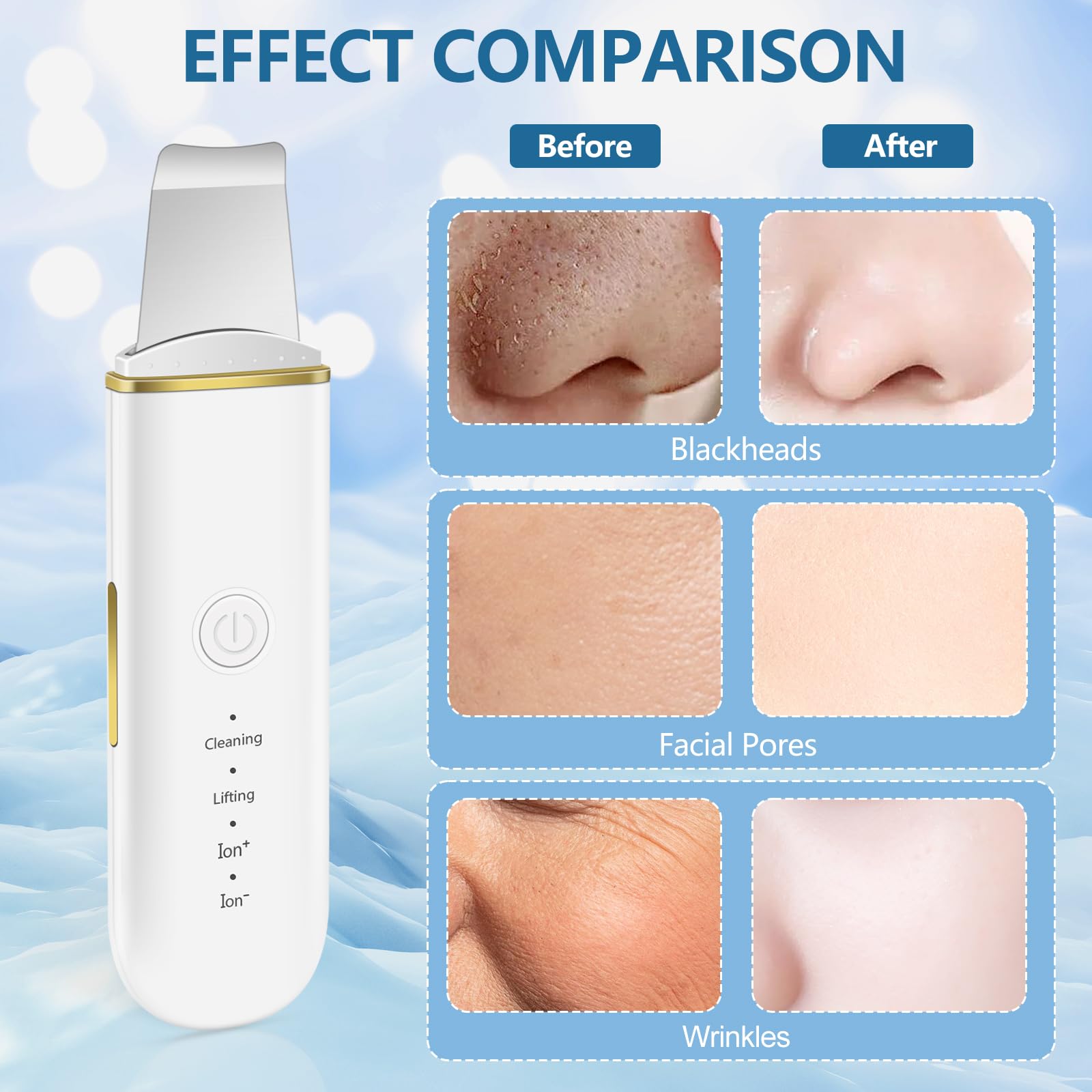 - 【DEEP SKIN CLEANSING】The ultrasonic cleansing knife exfoliator emits ultrasonic waves at a speed of 20,000+ times per minute. High-frequency ultrasonic vibration enhances the cleaning power of the device. It can effectively loosen clogged pores and remove stubborn blackheads, dead skin cells, cosmetic residue, etc. Gentle and painless procedure for treating depressed scars, acne, wrinkle treatment, face lifting and thick calloused skin.