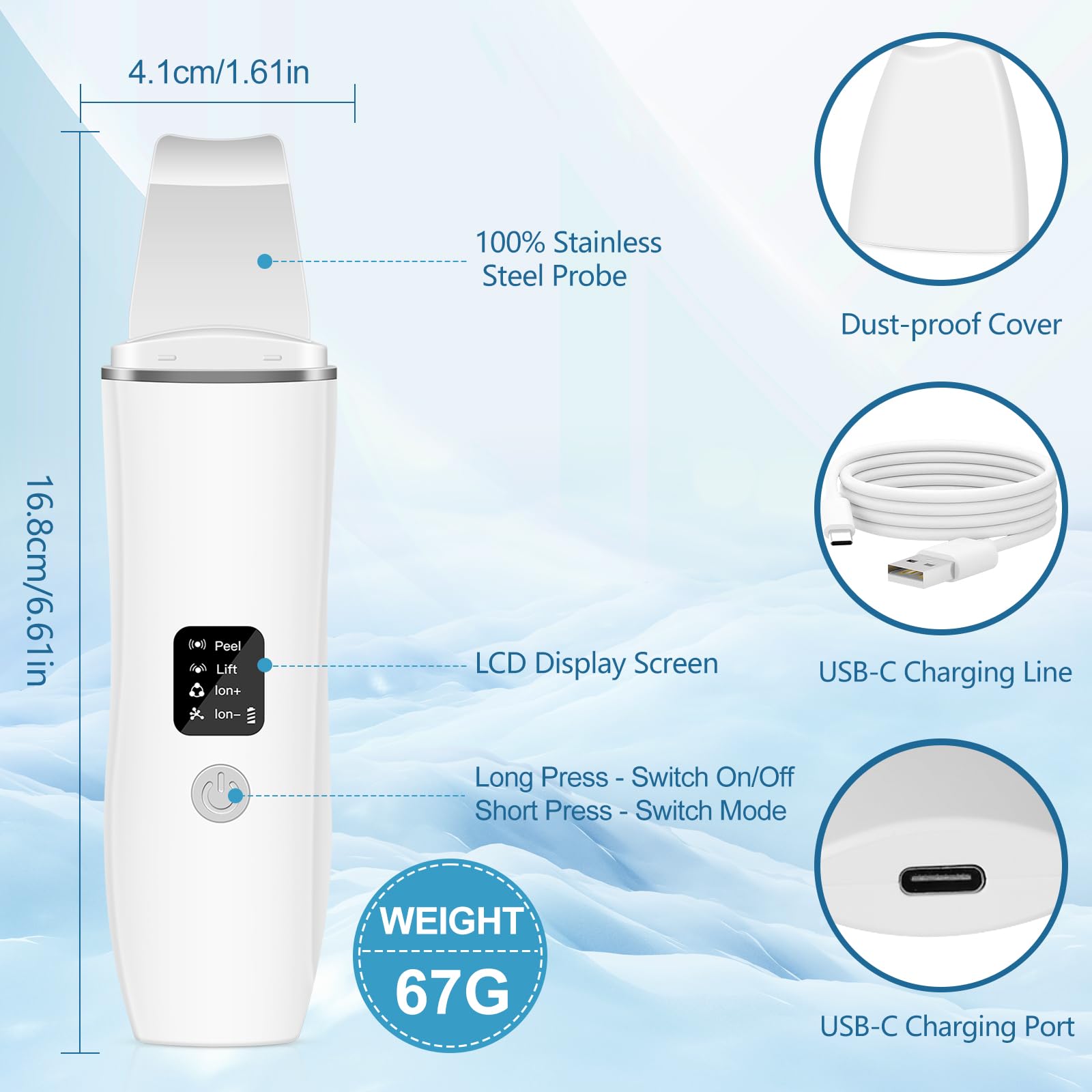 - 【SAFE AND EASY TO USE】Simple to operate and easy to carry, you can skin care like a beauty salon at home, suitable for travel and daily use. Just follow the instructions to complete your skin care process. They promote collagen regeneration, reduce wrinkle growth, and make your skin more elastic and firm. Note: Please moisturize skin before use or use with care products. The ultrasonic exfoliator has a time function and automatically turns off after 10 minutes.
