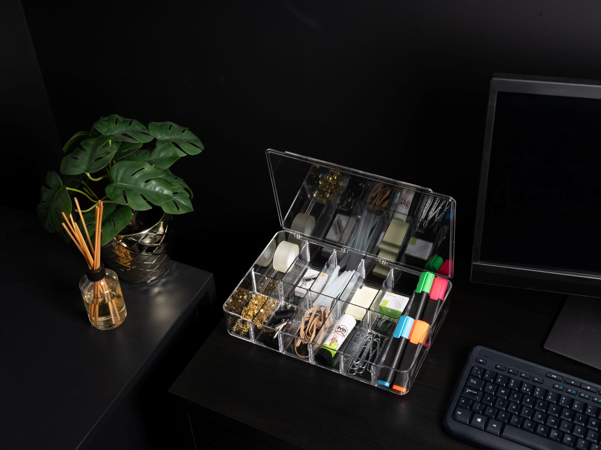 - Part of the Addis acrylic make-up or office stationary storage organiser display box range; Ideal for keeping all your cosmetic items of different shapes and sizes neat and tidy, easy to find; Holding your jewellery, lipsticks, makeup brushes, eye liners & shadows, nail polishes & clippers, skincare bottles, perfume & other skincare cosmetics; Home office school desktop stationary storage for pens, pencils, scissors, glue sticks, staplers & note books