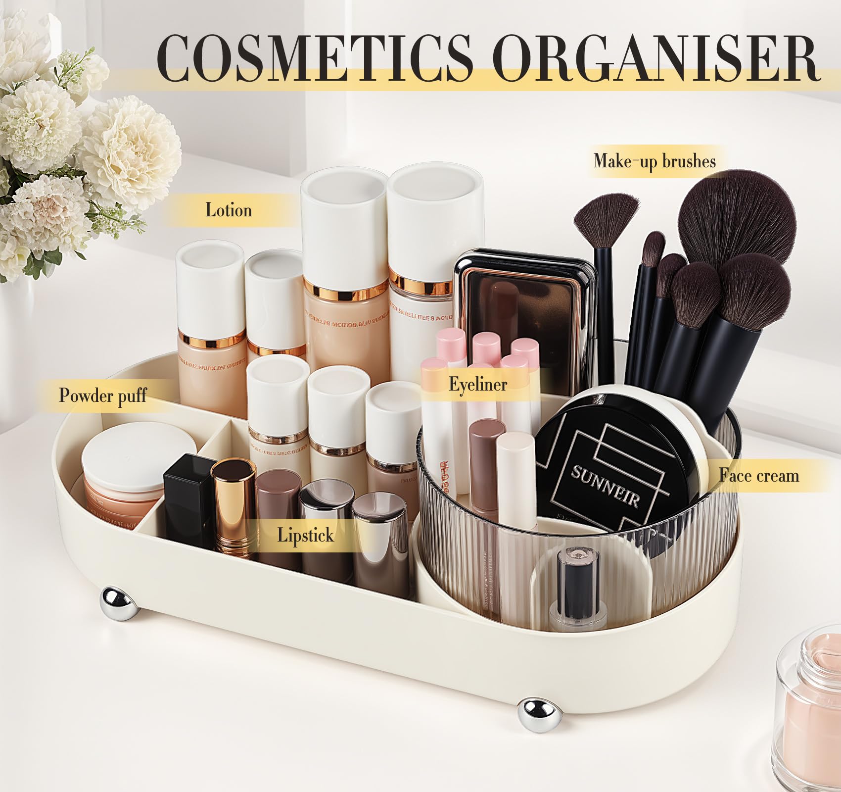 adorbox Make up Organiser, 360° Rotating Makeup Organiser, Rotating Compartment 2 In 1 Makeup Perfume Organiser for Makeup Table, Dresser, Bathroom, Bedroom, Desk (Off white)