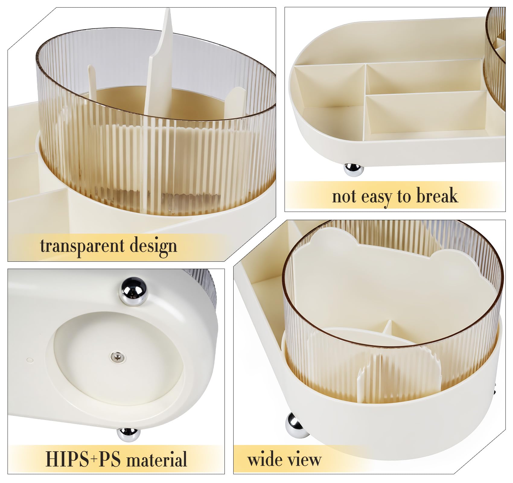- 360° Rotating Makeup Organiser: Make up organiser includes 4 large compartments and a rotating makeup brush holder that can rotate 360 degrees. Smooth rotation allows you to easily place and select cosmetics and makeup brushes