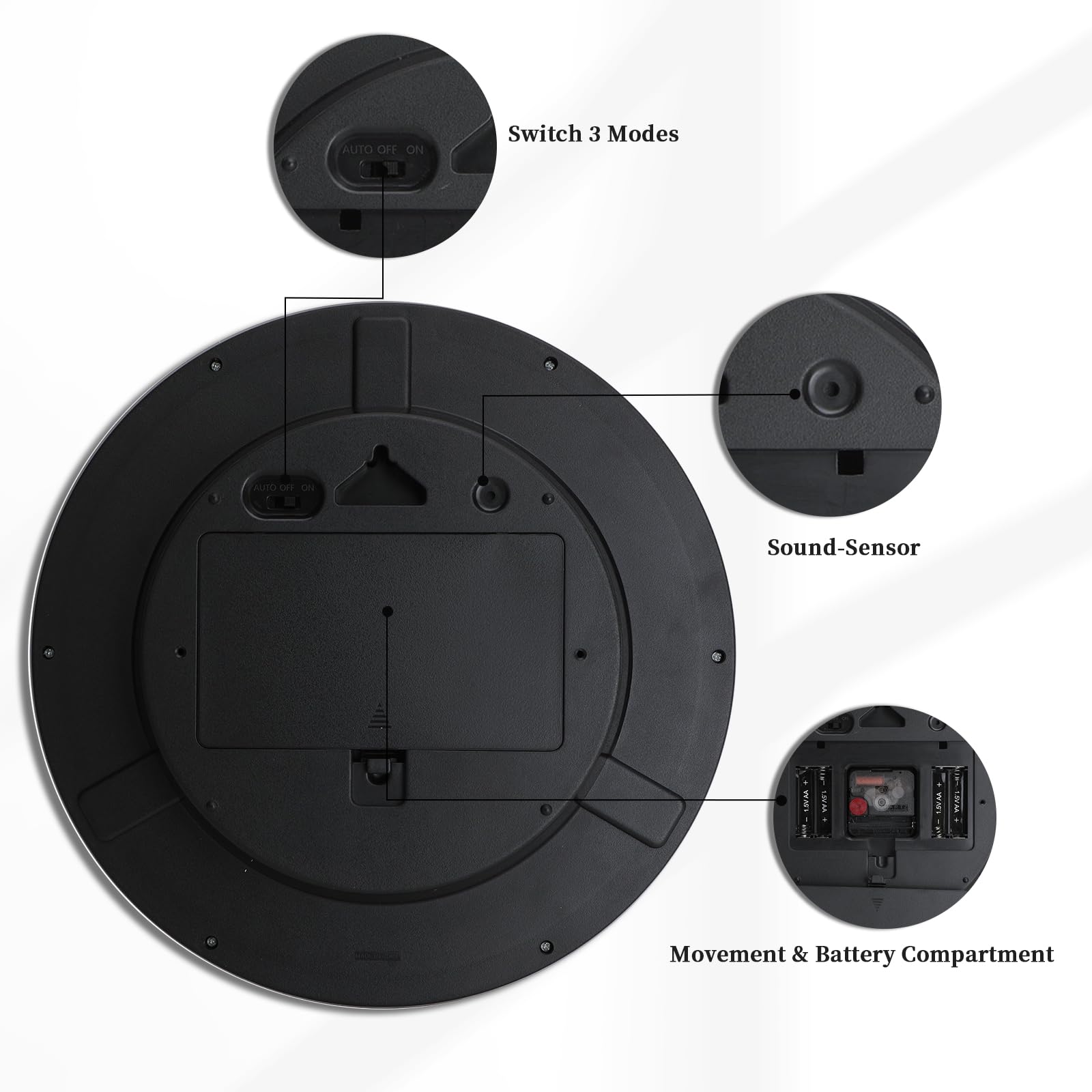 - Luminous Wall Clock: Our illuminated wall clock features a night light function that illuminates in the dark, making it perfect for the elderly, kids, or visually impaired people.3 modes SET, Choose the ''AUTO'' mode to detect the dark environment and glow in the dark by sound, lasting 45 seconds. Or choose ''ON''/''OFF'' modes to keep the light on/off in darkness